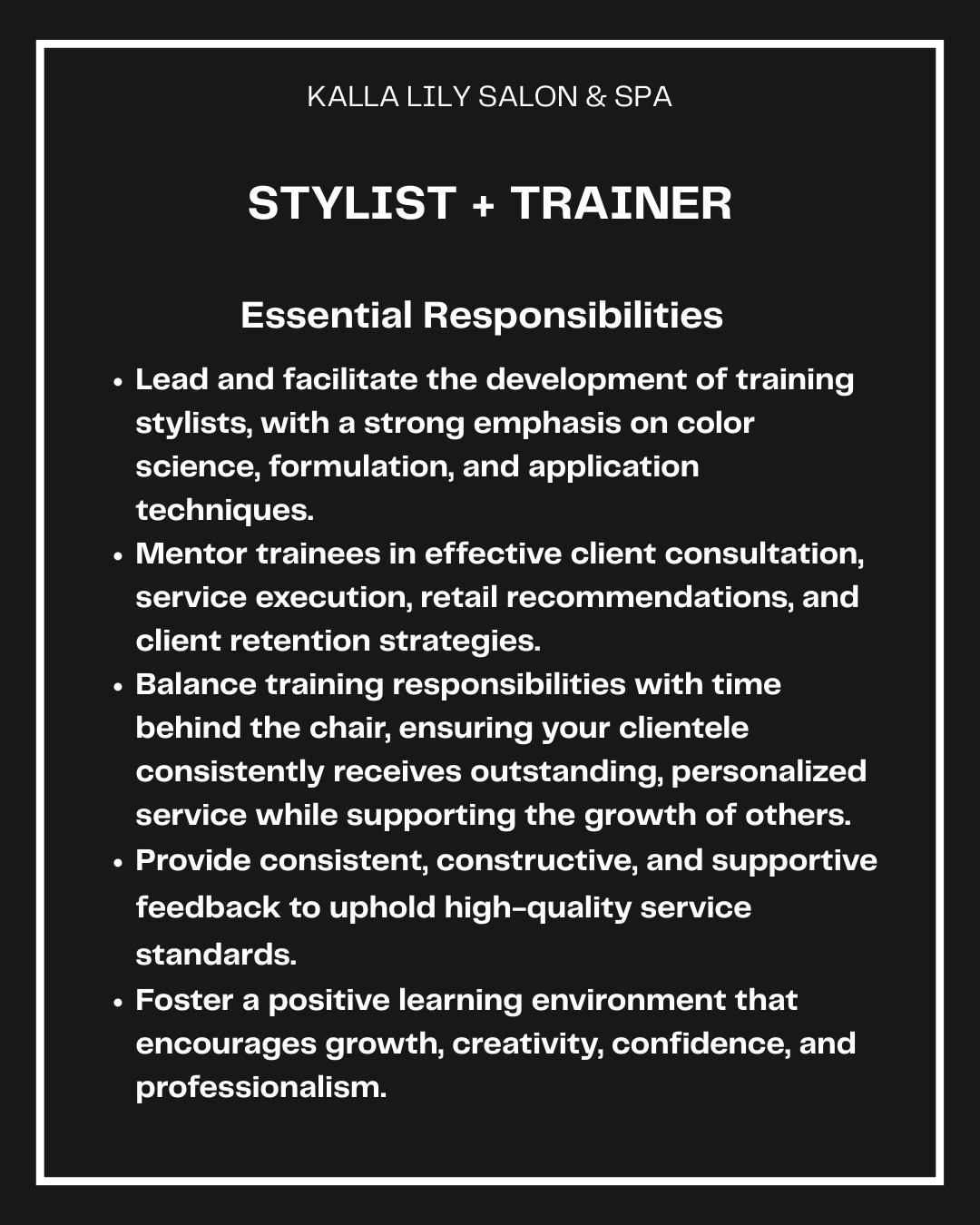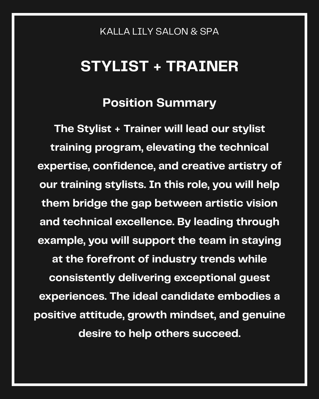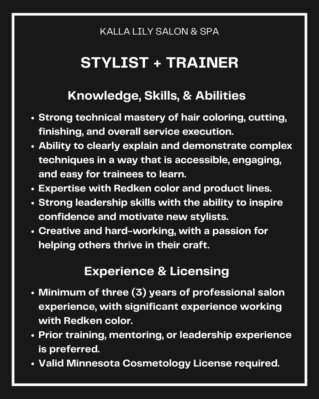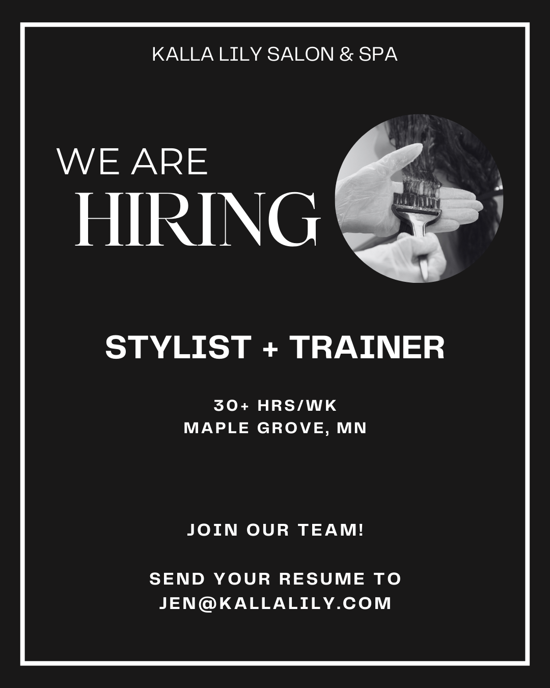 We are growing...Stylists, Estheticians, and Massage Therapists. Kalla Lily Salon and Spa is an upscale salon and spa looking for experienced team members. Qualified applicants should be enthusiastic, customer and goal oriented and seeking advanced education.